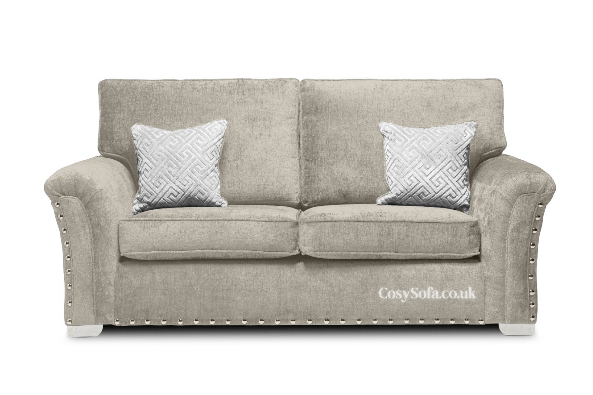 Our Harrison sofa offers a modern look with a slightly squared silhouette, boasting a fluffy Madrid fabric for added “COSY”ness. The facing of the sofa adds piping detail along with mini pleats, decorated with dark studs up the arms and across the base and geometric style décor cushions making this suite is simplistic yet a statement. Thick luxury fabric seating pads with quality foam fillings